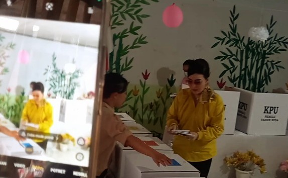 Tetty panggilan akrab masuk ke bilik suara menyalurkan aspirasi. Setelah mencoblos Ibu Anggota DPR RI Adrian Paruntu memasukan surat suara ke kotak suara. Lalu mencelupkan jari di tinta sebagai tanda telah memilih.